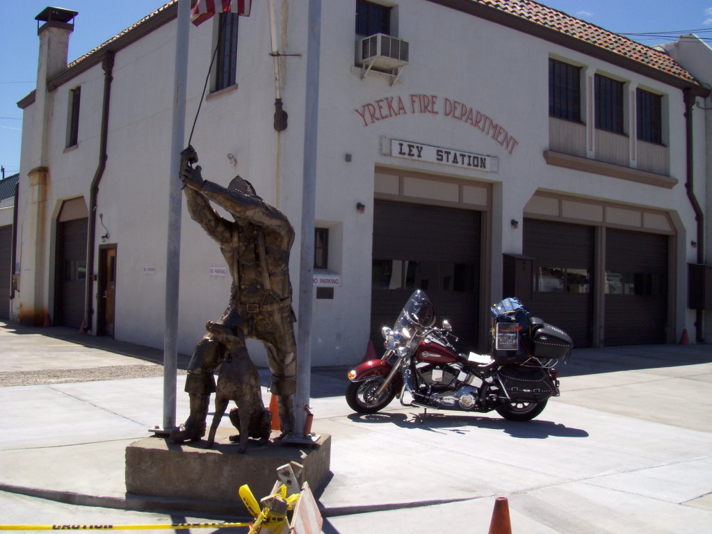 Yreka, California 96097 I was able to get a photo of the brass man and dog in front of the fire station. It appears that the Yreka Police Department is a room in the town library. |