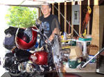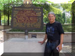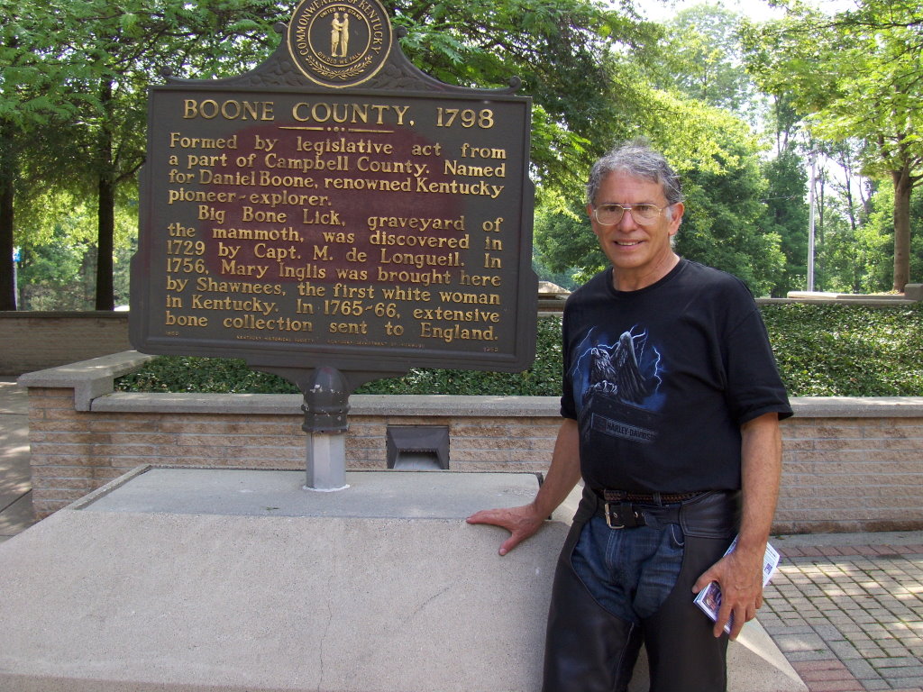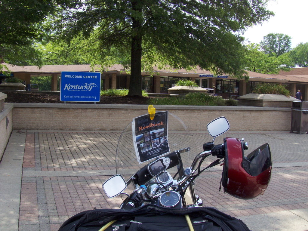 Louisville. I did come across a rest stop that was in the area where Daniel Boone actually wandered. Since I too was wandering through the area, I thought a photo with me in it was appropriate. A friendly, convenient wall had a niche for the camera on delay. While standing in line in a Wendy's a couple behind me asked about Lola. Turns out they have a Harley and enjoy touring together. We spoke for a while and compared notes. |