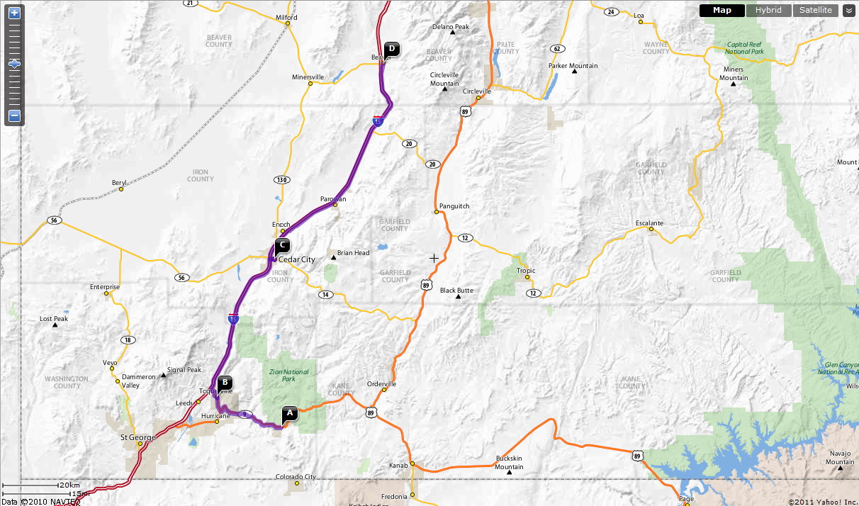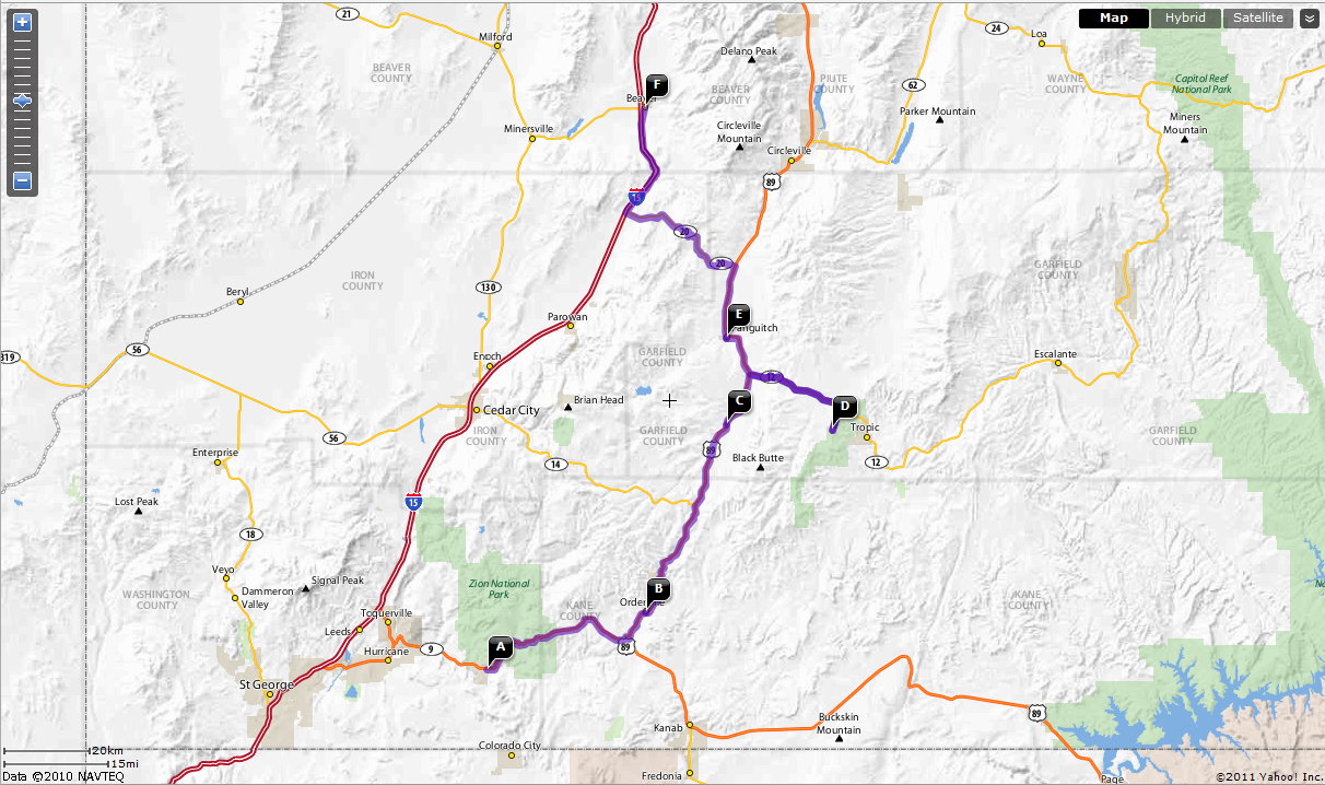 Side trip to Bryce Canyon adds about 60 - 75 miles compared to nominal route