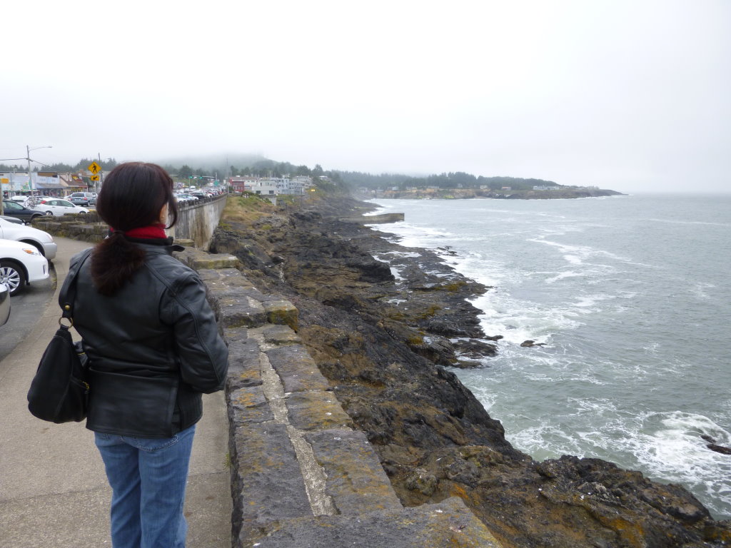 Yachats We stopped to have breakfast here just 24 miles up the road. We had visited Yachats about 2 years ago and found this place. listed on the chalk board. Not too crowded when we got there, but as we ate, many locals came in and they got very, very busy I had a bagel with some locally smoked lox, onion, tomato, capers, and herb cream cheese Carol had warm cereal with local blueberries. Look at the size of their standard tea cup. Leaving Yachats and throughout the rest