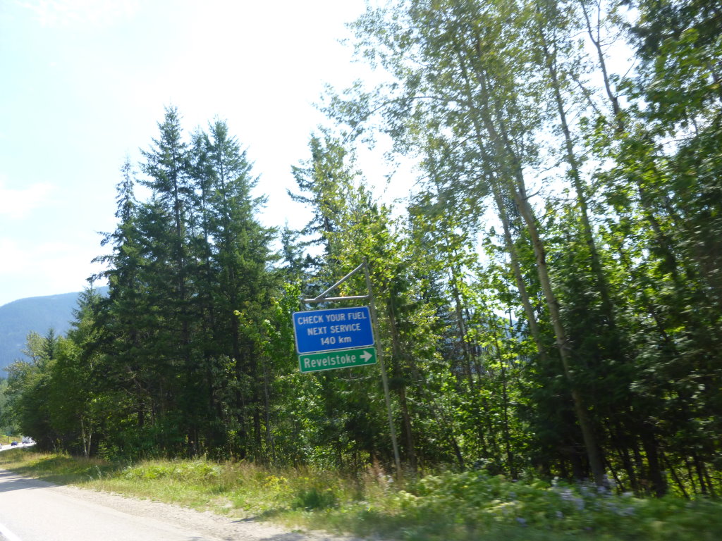 At this time, we had used about two-thirds of our tank of gas. Upon leaving Revelstoke, there was an ominous sign saying |