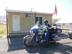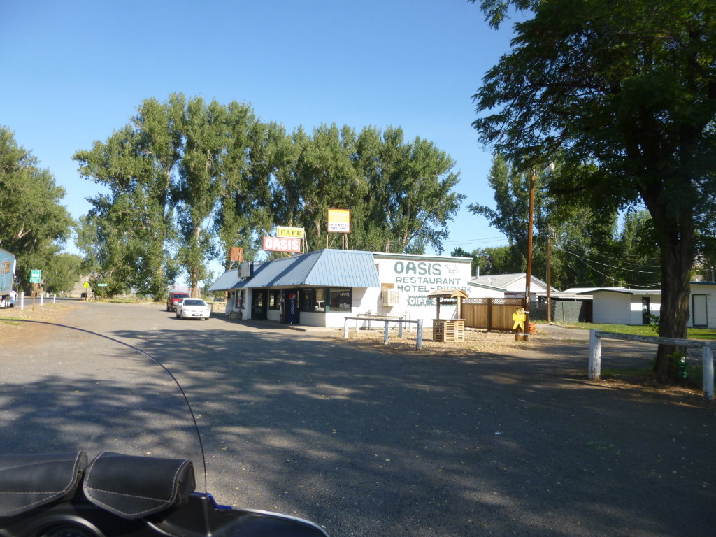 Oregon is blessed with many mountain ridges We went over several ridges some of which are over 4,000 feet. Often following the route of beautiful rivers. Often also little valleys with rich farms The grain trains here are not nearly so long as in Idaho or Montana Heading west, the next stop was Juntura (B) For a little town of around 200, this is the third year we have visited. Who would have thought?! We were also here in 2011 and 2012 We always stop at the Oasis Cafe and Hotel for a little bite There is a bus line that originates in Bend and runs as far east as Juntura Juntura has what must be one of the smallest post offices in America |