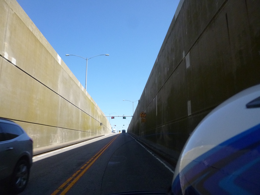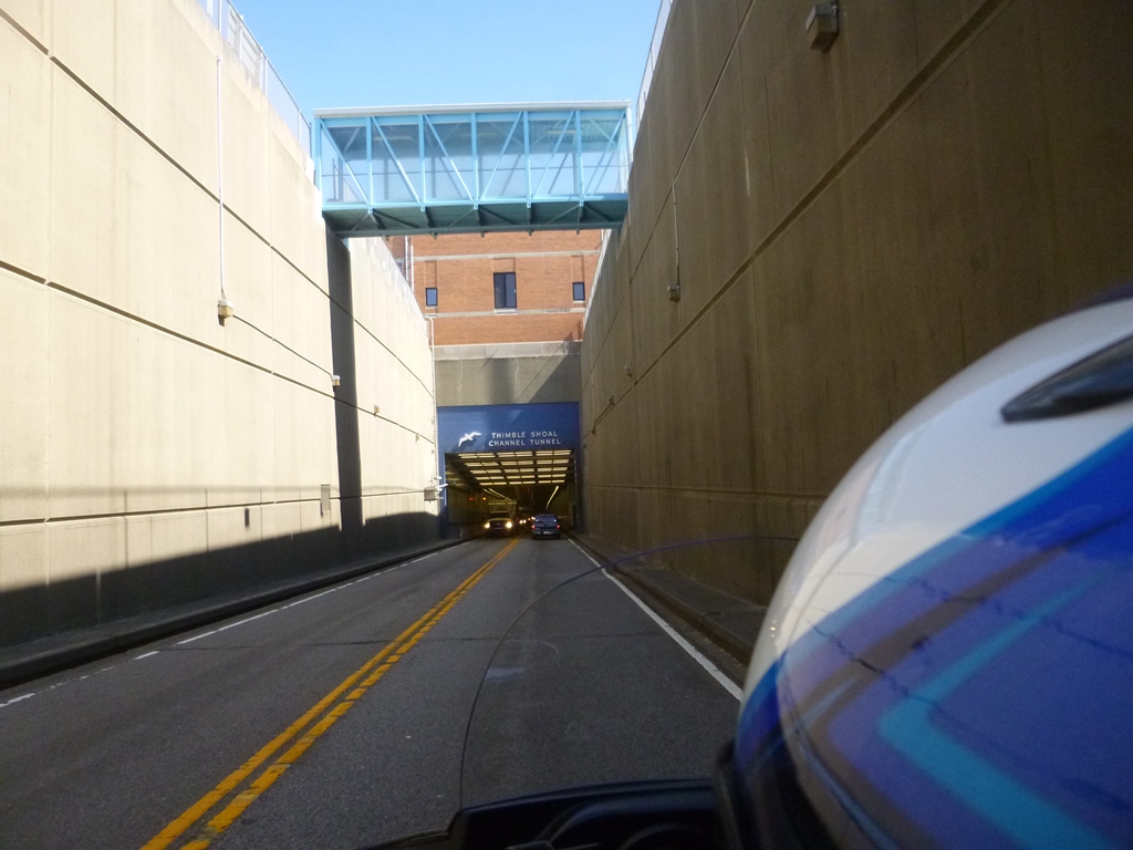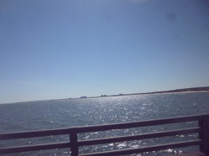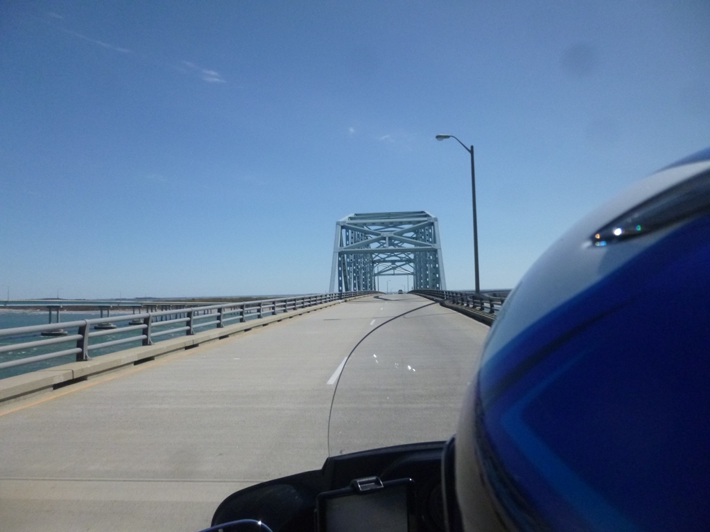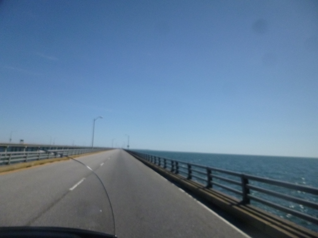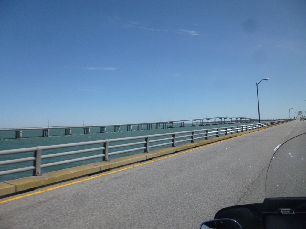 the middle crossing the Chessapeake Bay from Virginia main land to Virginia East Shore the Chesapeake Bay Bridge-Tunnel Crossed over/under and it was one of the highlights of our day I tried to measure with the odometer, but that is difficult in traffic with narrow lanes. I estimated it at over 15 miles start to finish. I looked it up afterward and it is 17.6 miles. You can see the google map, click here. For further information the Wikipedia write-up |