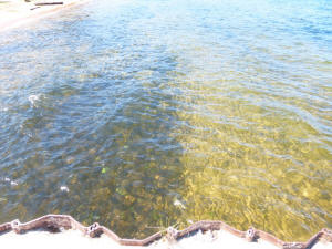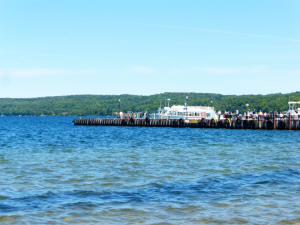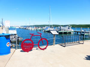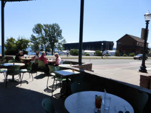 southern point of Lake Superior I stopped at the Post Office and mailed a box of acquired stuff home to lighten the load Then I went down and enjoyed walking around the shore There are cruises to some painted rocks along the shoreline of the lake People queued up to take the short cruise. There are bands of very dark sand on the bottom of the lake visible from the dock I am guessing that is iron ore powder from the 100 years of loading the ore in the area |