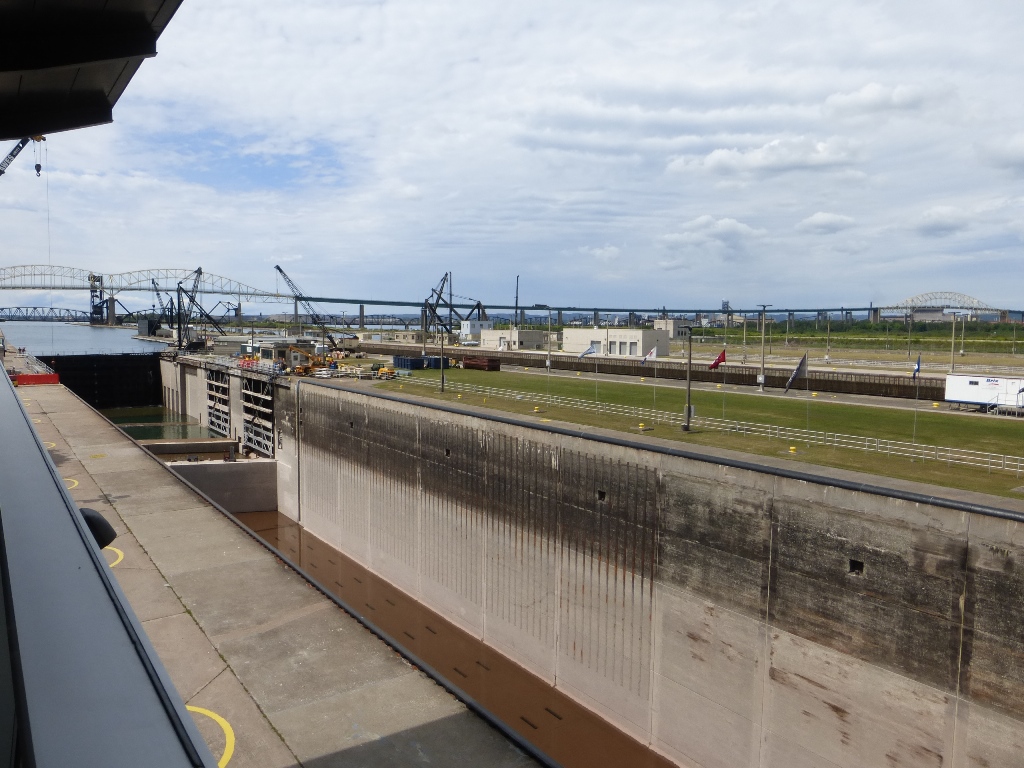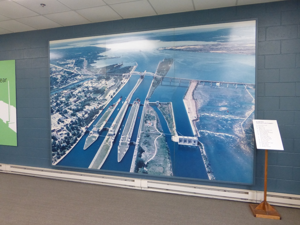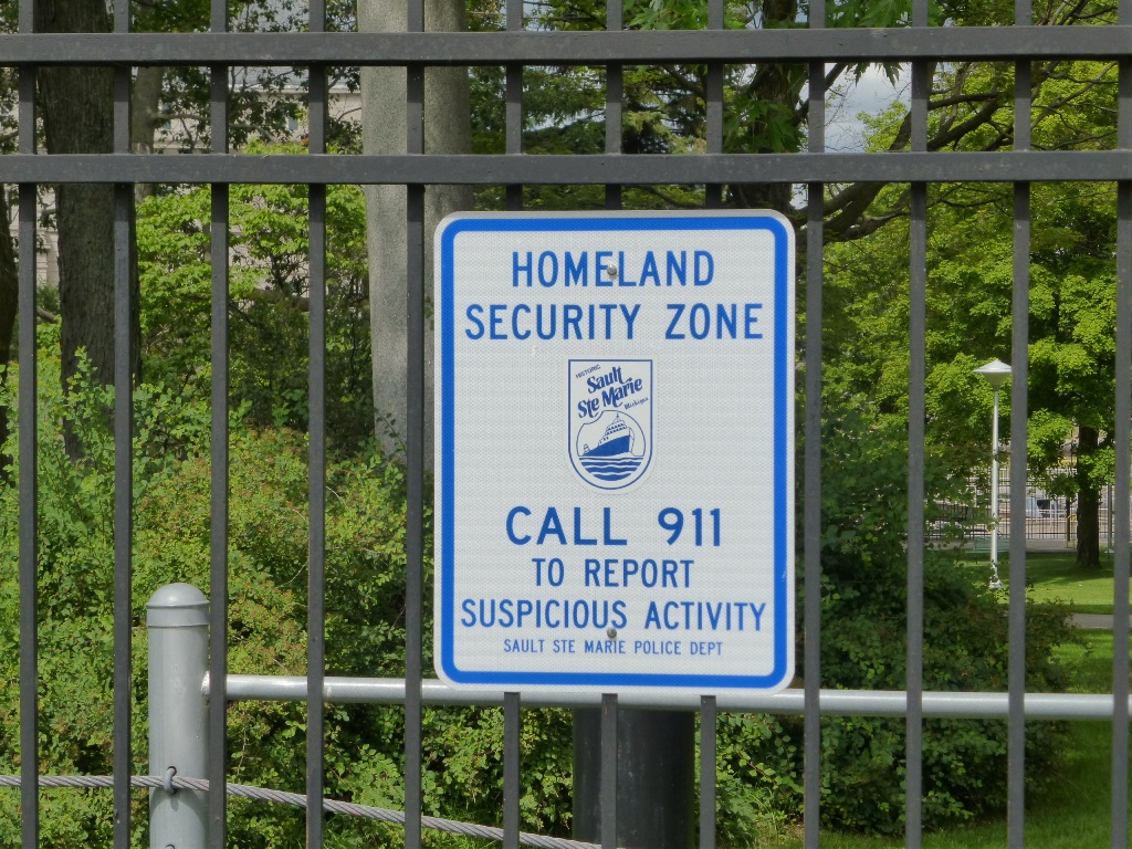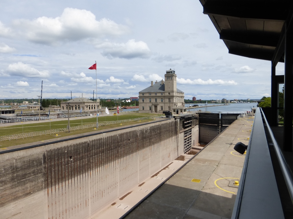 Soo Locks The difference in water level between Lake Superior and Lake Huron is 21 feet. The locks allow ocean ships access to Lake Superior. It is a very busy channel However, while I was there, no ships were in sight. The couple I saw earlier were my chance to watch the locks in operation and I missed it There is a nice visitor center As an important passage way, Homeland Security protects the locks |