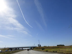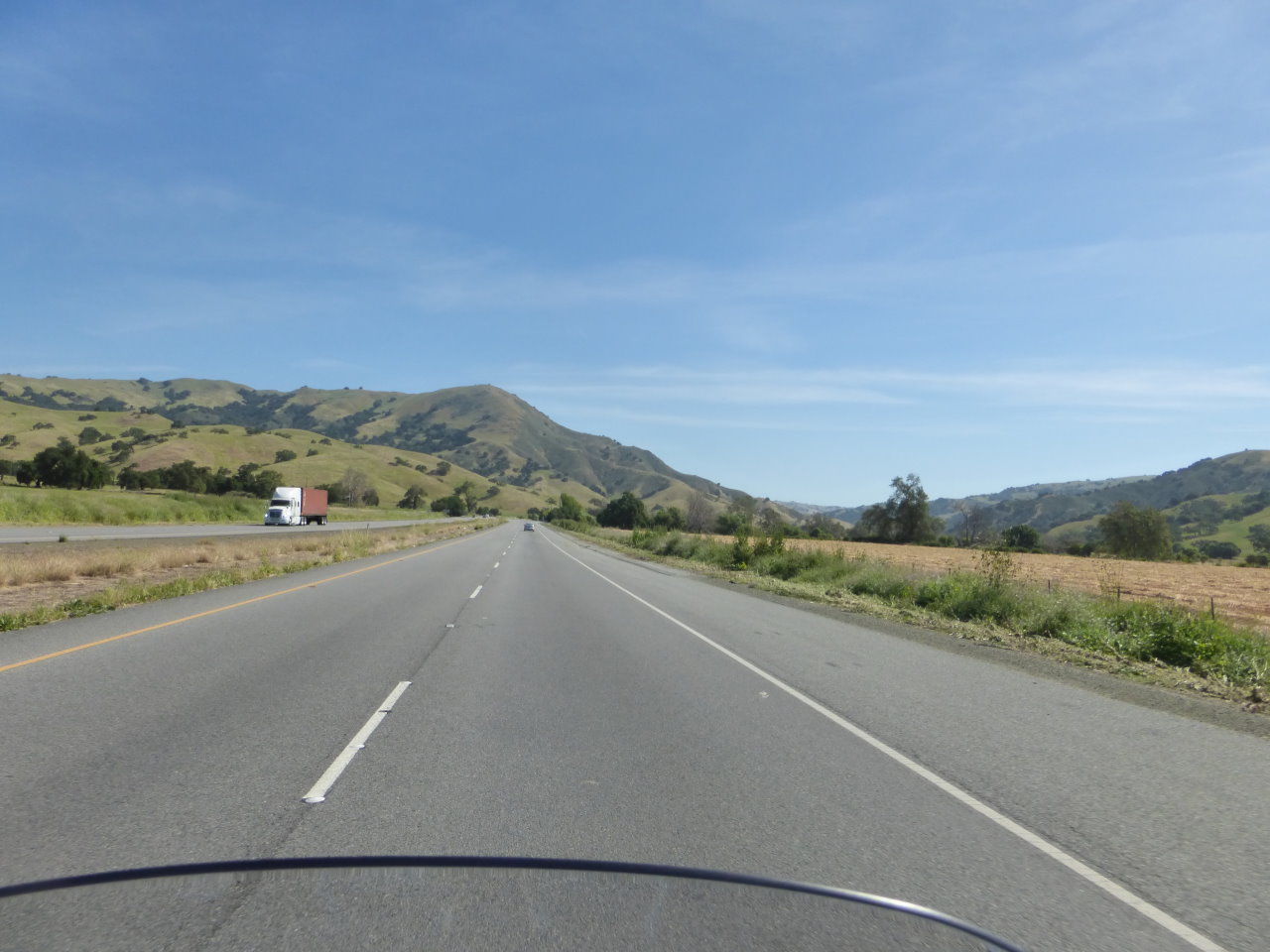 I left home exactly at 9:00 As I traveled down Hwy-85 I was thinking two thoughts How nice it is to be riding, and How long a trip this is going to be Well, long journeys begin with a single step so here I go The morning clouds seemed to be zig-zagging across the sky And the airliners were carving their paths in the blue It is still Spring enough for the hills to be green San Louis Reservoir on Hwy-152 is absolutely full |