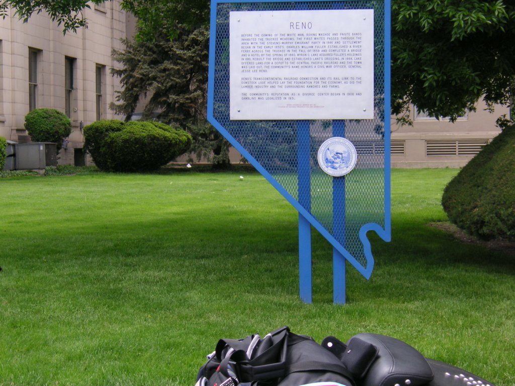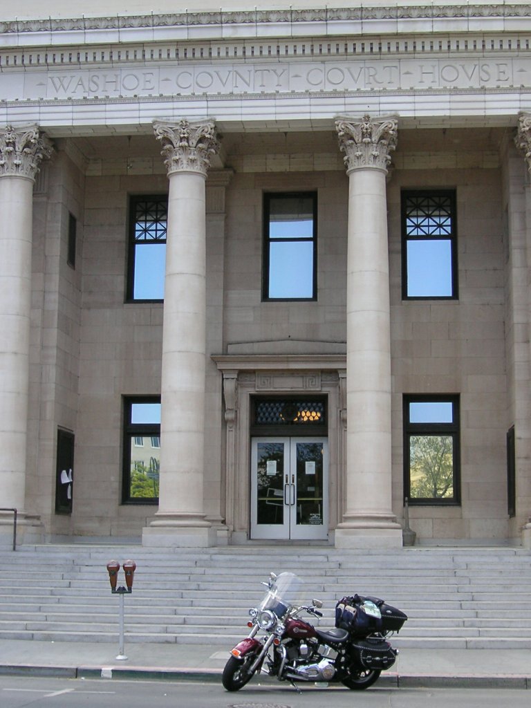 Reno, now I was very hot. It was a harbinger of worse heat yet to come. Wandered around Reno trying to find a Washoe County sign. Finally found the Washoe County Courthouse. It's over 80 degrees and windy as I leave Reno. |