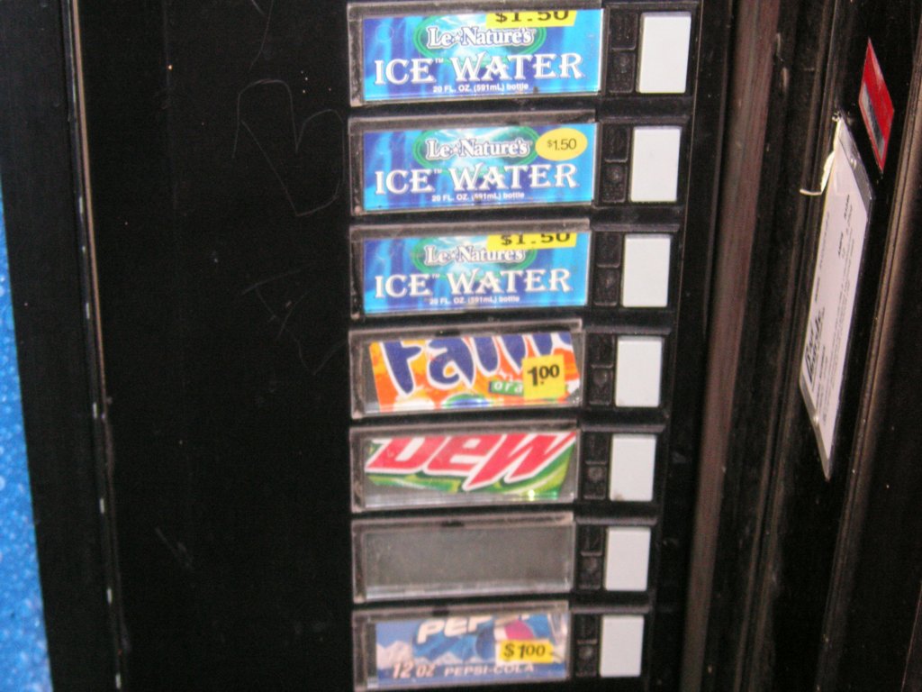 bottle of water in the vending machine because it is cold. The label on the bottle says Le Nature's Water. Must be