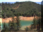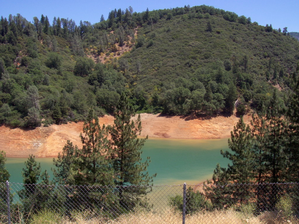 Shasta. Behind the stop is a finger of the lake. The water is green with algae.