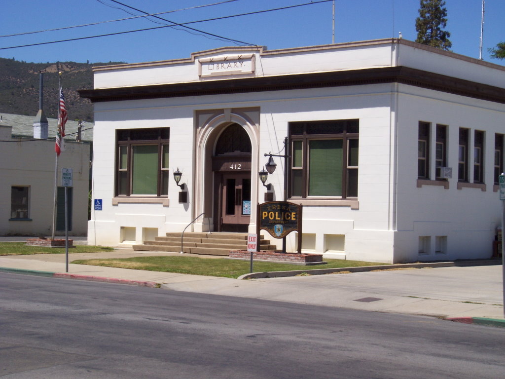 Yreka, California 96097 I was able to get a photo of the brass man and dog in front of the fire station. It appears that the Yreka Police Department is a room in the town library. |