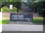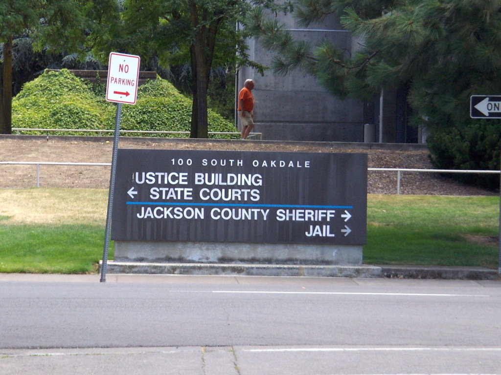 Medford, Oregon 97501 I found the place all right, but the best sign for a photo was under a No Parking sign. I thought it not good to park in a no parking zone right in front of the sheriff's office. But I did get a reasonable Jackson County picture. |