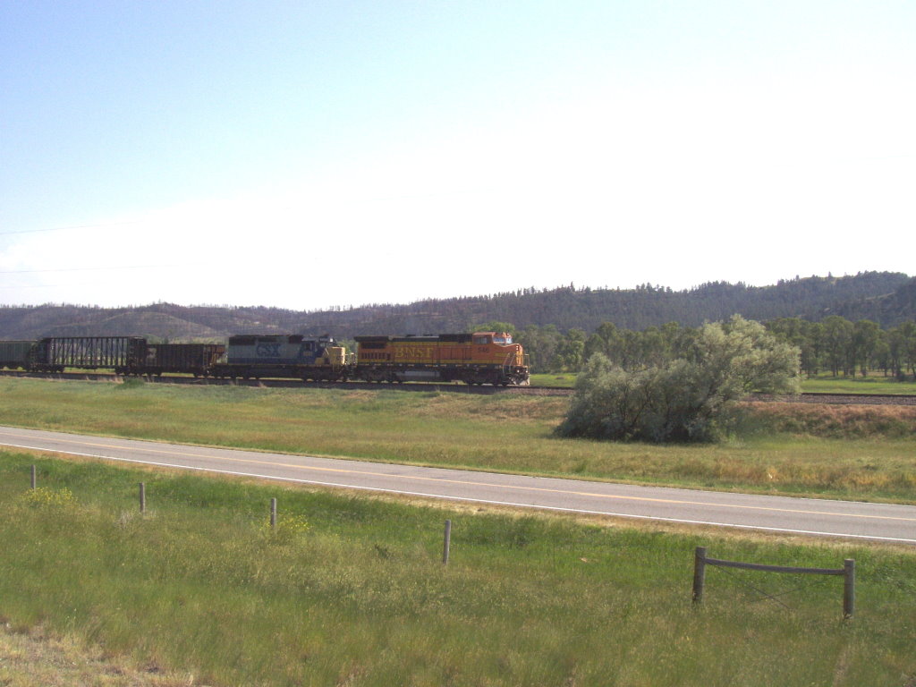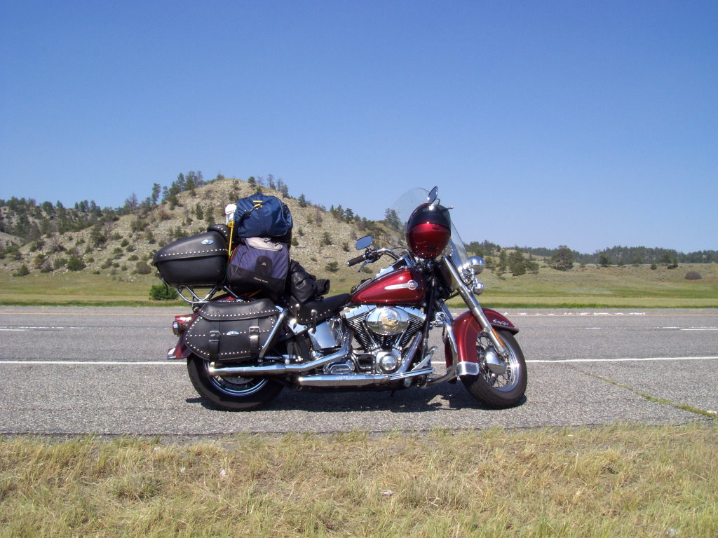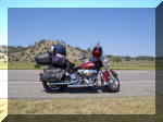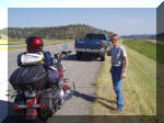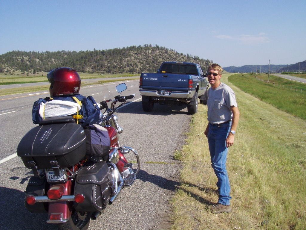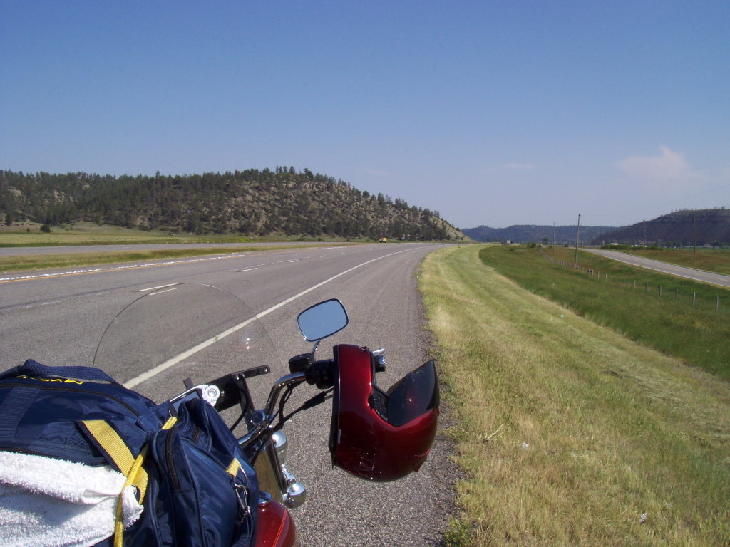 Rocker, Montana. Not to worry, though, a gas station should be available every 20 miles or so, right? Wrong! this is Montana. Note on the map that all the named entities in the 50 miles approaching Columbus are little tiny circles. Too few people to actually support a local gas station. I wish I had paid more attention before I rode there. See my gas planning here. Well, I diverted from the plan by gassing up a little early. As a result, this leg was getting too long without a casual encounter with a convenient gas station along the way. I was getting pretty dry when I came to the little town of Reedpoint. The highway signs say there is gas here. Sure enough there is a Sinclair station. You know, the kind with the cute little dinosaur. When I pulled up to the pump, there was a hand-written sign that said no gas here anymore. Go to Columbus, 18 miles further. I made 12 of those miles. What does one do in the middle of nowhere on the four foot wide shoulder of an Interstate with cars and trucks zipping by at 75 MPH? Well, I called AAA. A nice operator, Norma, in Arizona picked up and I tried to explain where I was. She connected me to someone, I missed the name, in Montana who claimed she wanted nothing to do with me. At last, she did give me the number of someone in Columbus who could help. After explaining to Sally what I needed, she promised to send someone out and that a dispatcher would call me to tell me when to expect help. About 20 minutes later, my phone rings and the nice dispatcher apologizes for taking so long. His primary operator is hung up. But he did locate someone who could come help, but he would be 30 to 40 minutes but he is on the way. During this time, a lot of bikers rode by some in groups, some singly. Almost all waved, but none stopped. There's probably some secret hand signal that means please stop, I could use some help or at least some company while I wait. I'm not aware of what it is. The most surprising part was that a Sheriff Deputy drove by on the other side of the highway. He and I made eye contact and then he went on his way. I expected him to find a place somewhere up the road to make a U-turn and then come back to see what I was doing on the shoulder of the road. He never returned. At one point, a train rolled by. That was fun and occupied about five minutes of attention. Finally, a big blue pickup truck approaches on the other side, slows and then just drives right across the 30-40 feet of grass divider strip. I think he said his name is Wayne Monroe. A nicer fellow I couldn't have asked for. He poured two gallons of premium in my tank and everything was good again. This whole affair lasted almost exactly an hour. What made it seem like an eternity was that it was in the 90's out with bright sun and no shade to be seen anywhere. I am red in the face for having run out of gas and I am red almost everywhere for having stood out in the Montana sun. |