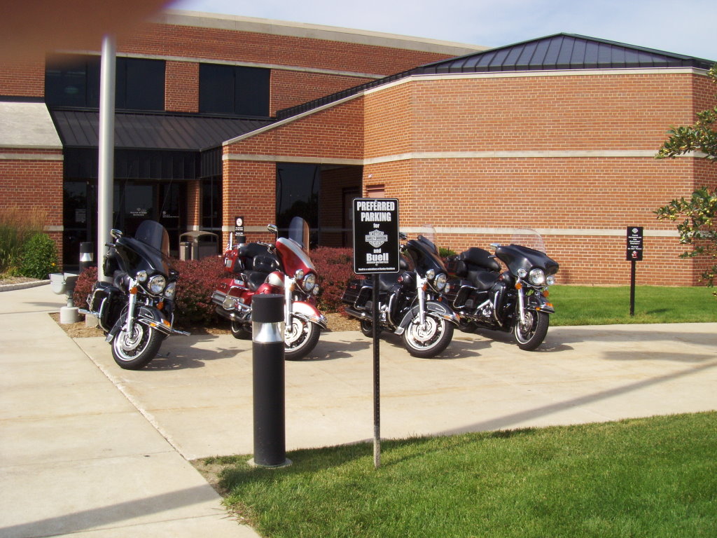 Harley-Davidson Plant - Wauwatosa here. 11800 W. Capitol Drive, Wauwatosa, Wisconsin 53222, A photo here is one point. This is a beautiful plant, but is only open for visitors on Saturdays. Naturally, there is priority parking up front for employee and visitor Harley-Davidsons. Lola felt a thrill; some of her parts were manufactured here. She enjoyed saying hi to her younger brothers and sisters. I decided to try to navigate surface streets between the HD plant and the HD headquarters. Turned out okay, but took much longer than expected and I spent a lot of time in neighborhoods where I was definitely an outsider. The driving habits of the local people seem to be obeying different rules than I'm used to. People zipping in and out of here and there in directions that have little to do with the white line down the center of the street or the current lane count. |