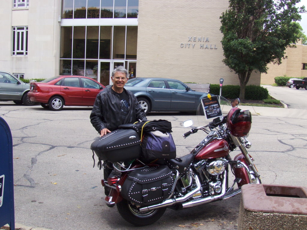 Illinois. These are the closest "X" cities to California. I found the post office, but it had no sign for the city. A large, old, stately building, but it only said "United States Post Office" I searched around and finally found the city hall. Across the street is a little park and a gentleman sitting on a bench, probably enjoying his lunch hour. When I asked if he could take my photo, he was very happy to do so. A nice guy. Xenia has a Harley dealer. Buckminn's Harley-Davidson,