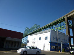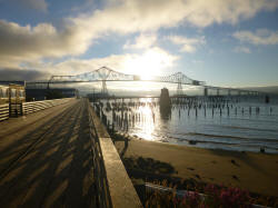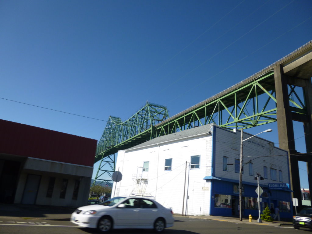 Astoria (B) The Astoria Bridge is beautiful. It connects Oregon with Washington across the mouth of the Columbia River. It is very tall because ocean ships pass beneath it. Because it is so high, you have to head south and up the circular ramp back over the tops of the city to head north. We