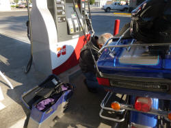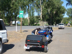 Vale. The distance was just about perfect to fuel up. We were getting toward the bottom third of the tank and a full tank would last the day On the way here, the cruise control went out along with the turn signals. Oh, oh, but we had experienced this before and I knew what it meant. The trailer has been wonderful and performed very well There is one weakness though. The way they routed the wiring at the factory runs the lights past a raw edge of metal in the tongue When the insulation wears through, a fuse blows on the bike. I adjusted the wire routing and hope that it will be okay for the remainder of the trip I did not remember which fuse, so I had to search through abou a dozen. Finally, I found the culprit, the on marked ACC. Makes sense since it supplies the cruise control, the turn signals, and the brake lights |