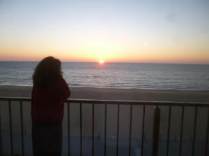 experience for each of us: a sunrise over the ocean. Very pretty Hit the road and travelled down the row of hotels. It was below 50 degrees, cold! Then across the flat, swampy areas Wondered what would happen around here if the ocean level rises. |