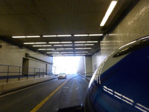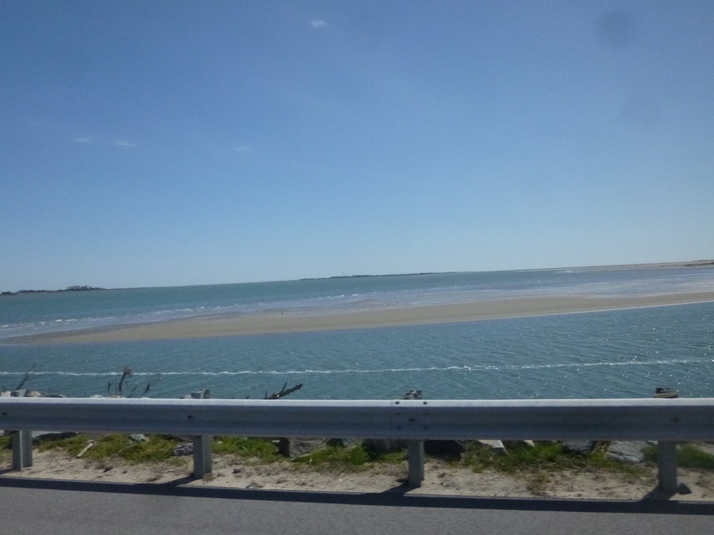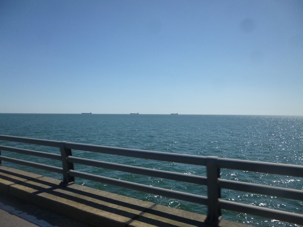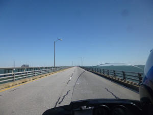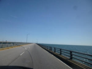 the middle crossing the Chessapeake Bay from Virginia main land to Virginia East Shore the Chesapeake Bay Bridge-Tunnel Crossed over/under and it was one of the highlights of our day I tried to measure with the odometer, but that is difficult in traffic with narrow lanes. I estimated it at over 15 miles start to finish. I looked it up afterward and it is 17.6 miles. You can see the google map, click here. For further information the Wikipedia write-up |