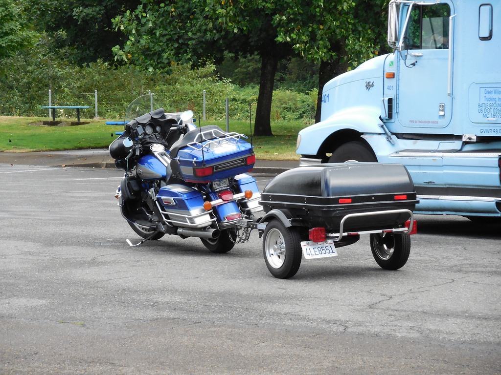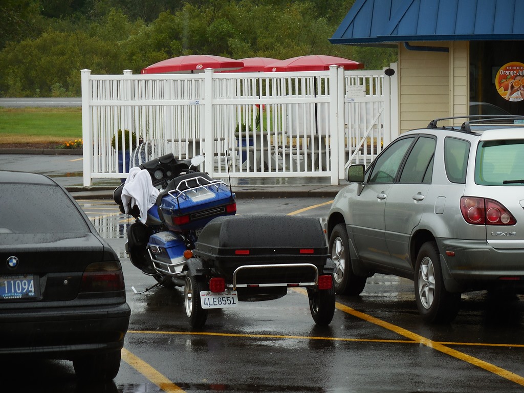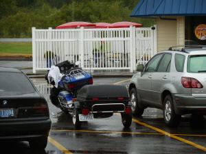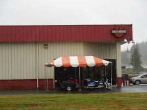 jacket but not the pants. Most of the time my chaps are sufficient to keep my bottom half more of less dry Alas, my chaps are home, I meant to pack them, but my memory sometimes is a little errant. My jeans, my legs, my butt and several other parts of my anatomy got pretty soaked and very cold. About 30 miles eastward, about half way, there was a little shopping area so we stopped. A Dairy Queen and a Subway and I did not feel like ice cream. The Subway had some coffee and a little chicken dumpling soup. A few miles south of where Highway 126 enters Eugene is Latus Harley-Davidson of Eugene Maybe I can get some more rain gear and slip into some dry Levi's while I'm there This used to by Doyle's Harley-Davidson and I did not really like the folks there. Not friendly, not helpful, a shop with bad vibes. Latus is just the opposite. A real improvement They had a canopy out front with room for Bela and the trailer. How nice. I asked about a rain suit. The nice lady showed me some and then said she would check the clearance rack She came back with a pair of rain pants from a broken set, $63.00 Hmm, a whole suit for almost $200 which would be redundant in the jacket or a bargain pair of pants. A no brainer stroke of luck. |