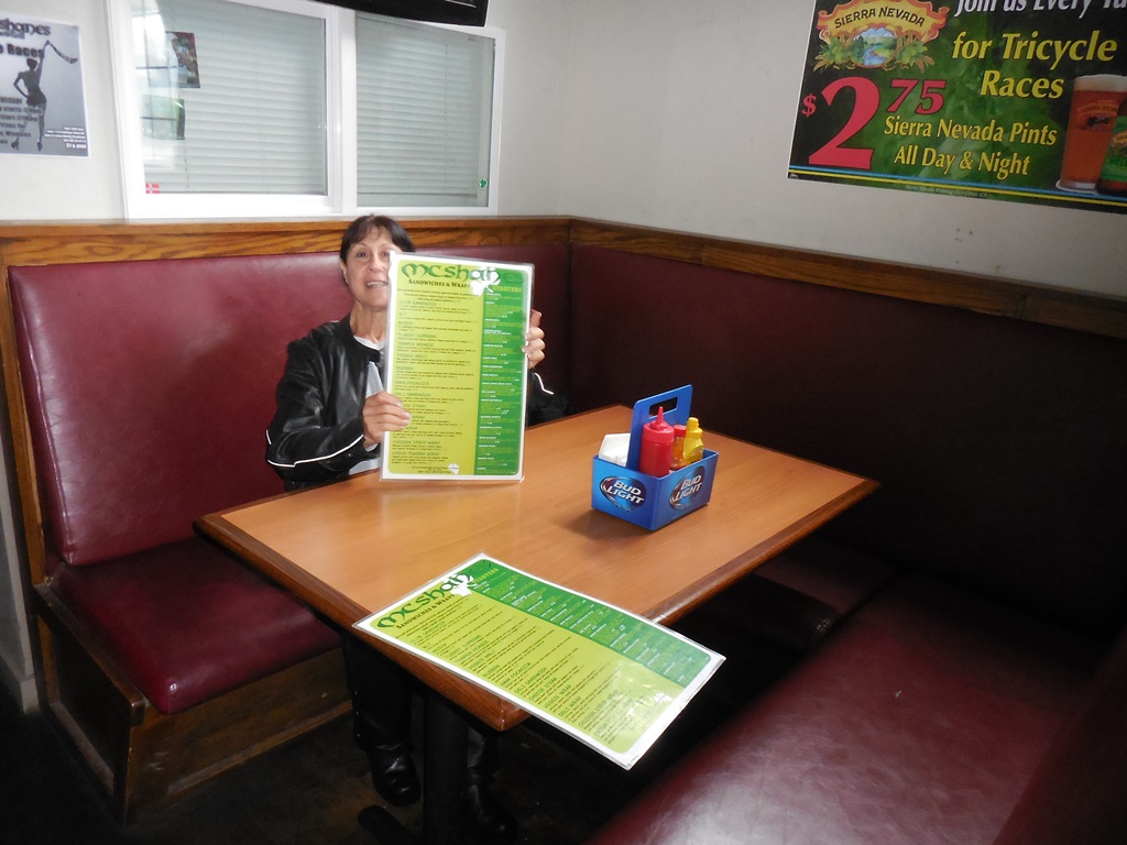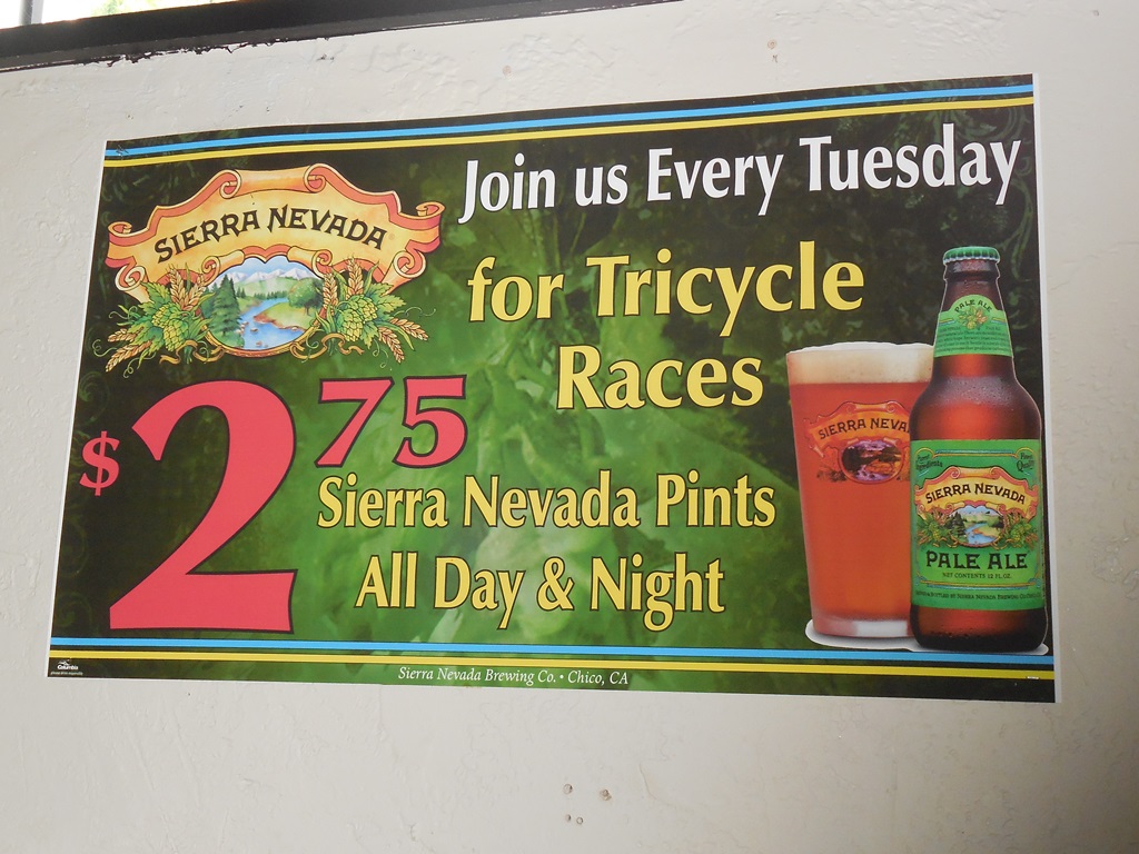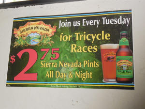 Next door is a saloon kind of place, McShane's Carol and I had stopped there once before and found it to be a bit outlaw, but good food. We had lunch there and it was good. We missed the Tuesday tricycle races by a day. They have all sorts of tricycles in the rafters as part of the eclectic decor. |