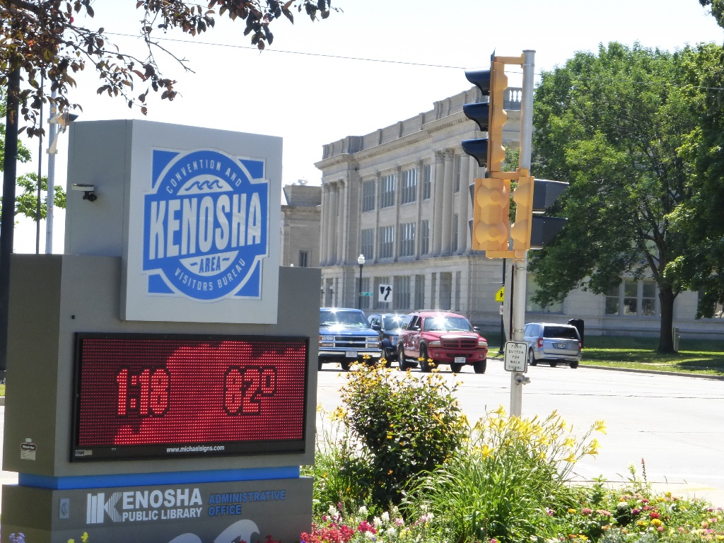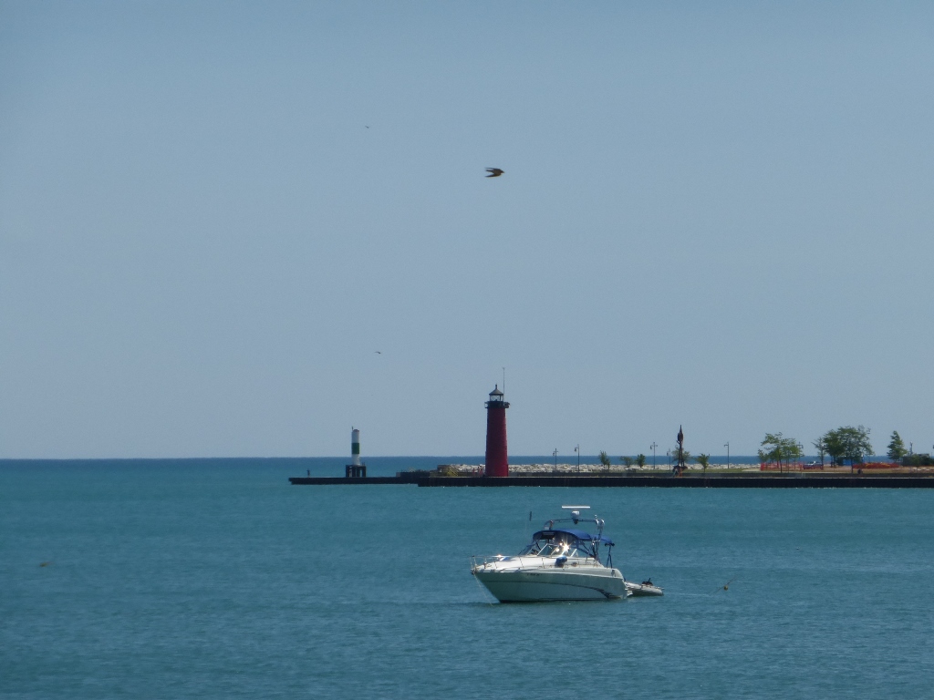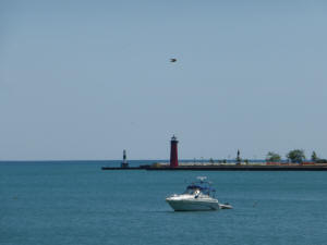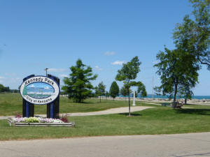 Wisconsin As I rode through the town, I noticed some blue to the east a few blocks down the streets I headed toward there and found Lake Michigan shoreline There is a nice Kennedy Park with sand beaches and vast lawn areas In the right photo above you can see a blur just above center. That is a dragon fly that buzzed by just as I was taking the photo. They are big here. I was planning on getting a photo of Kenosha County Courthouse For a "K" county letter but I got so excited at being at the lake that I forgot |