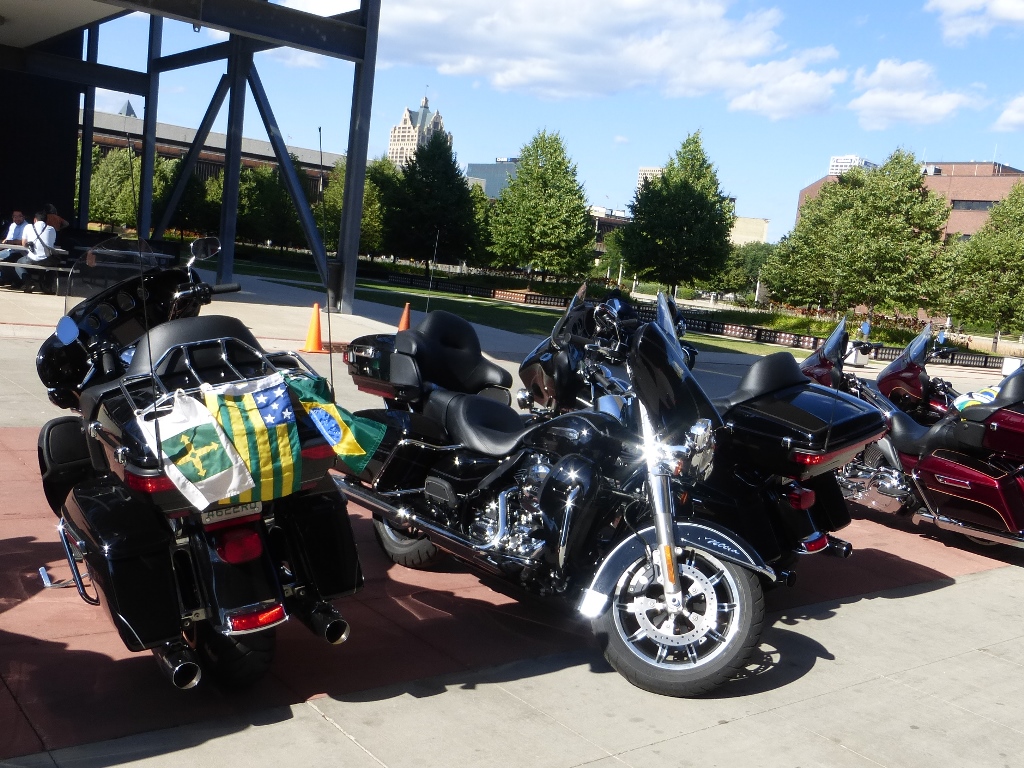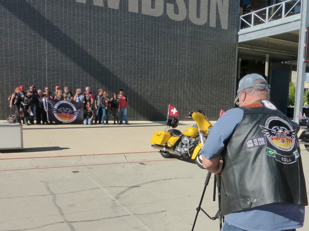 One of the highlights of this part of the trip was to be the Harley-Davidson Museum. It did not disappoint Hundreds of bikes from some of the very earliest through all the years It was a bit startling to see bikes in a museum that are newer than mine. There is an entire building dedicated to Willy G. Davidson, chief designer for many years I noticed a group photo happening It was a large group of riders who are from Brazilia Harley enthusiasts touring the U.S. |