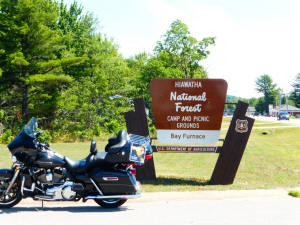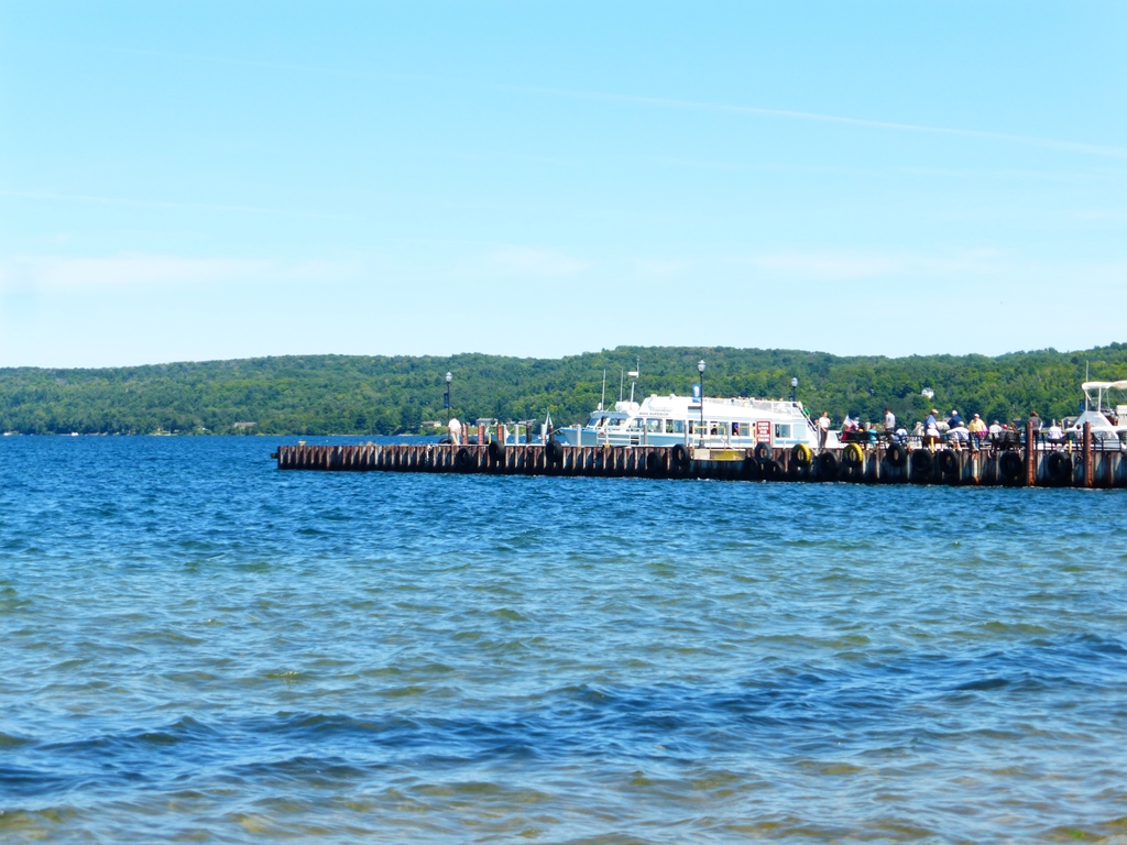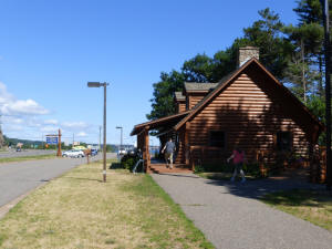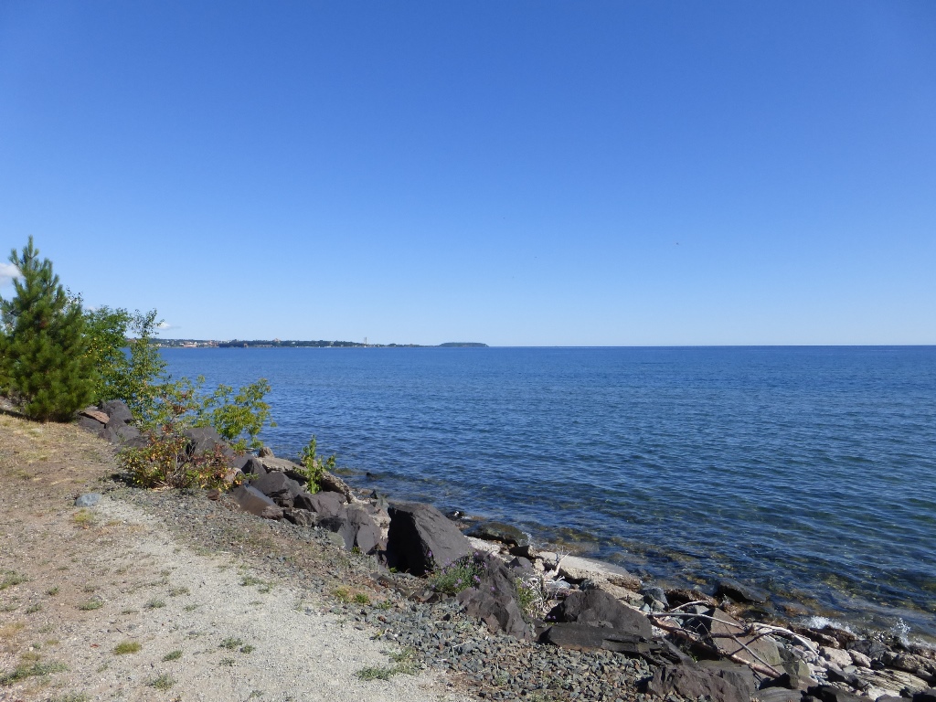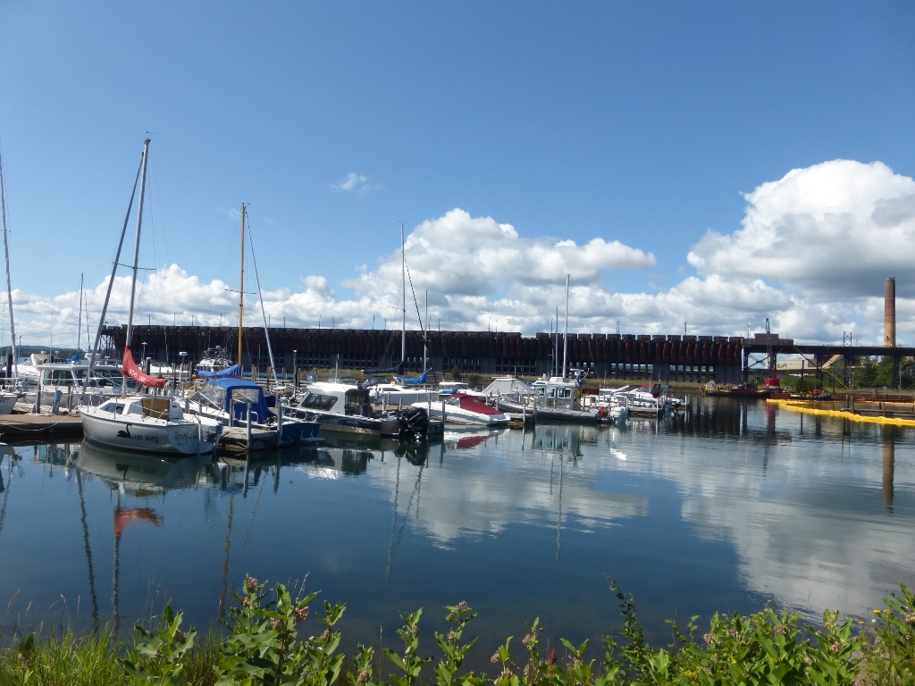 southern point of Lake Superior I stopped at the Post Office and mailed a box of acquired stuff home to lighten the load Then I went down and enjoyed walking around the shore There are cruises to some painted rocks along the shoreline of the lake People queued up to take the short cruise. There are bands of very dark sand on the bottom of the lake visible from the dock I am guessing that is iron ore powder from the 100 years of loading the ore in the area |