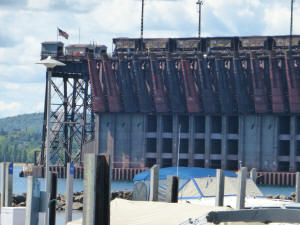 giant ore docks this one was in operation until 2012. railroad cars moved out on tracks at the top and dumped ore into the huge bins a ship moored alongside the dock was then loaded via chutes that lower on the side all by gravity alone They retired many ore cars on top of the dock as a heritage for future visitors You can see more information (click here) |