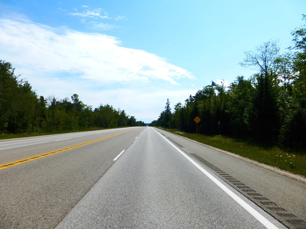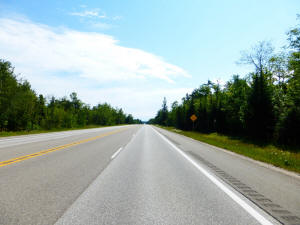 The weather was very nice, a little cool, but clear and no wind The traffic was extremely light When there were more than 4 cars in sight counting both directions, it felt like a traffic jam during rush hour Up 'til the last 20-30 miles, the road was very flat I was excited to see some rolling hills ahead in the cut through the trees |