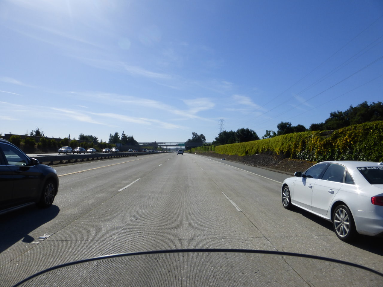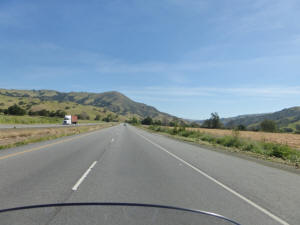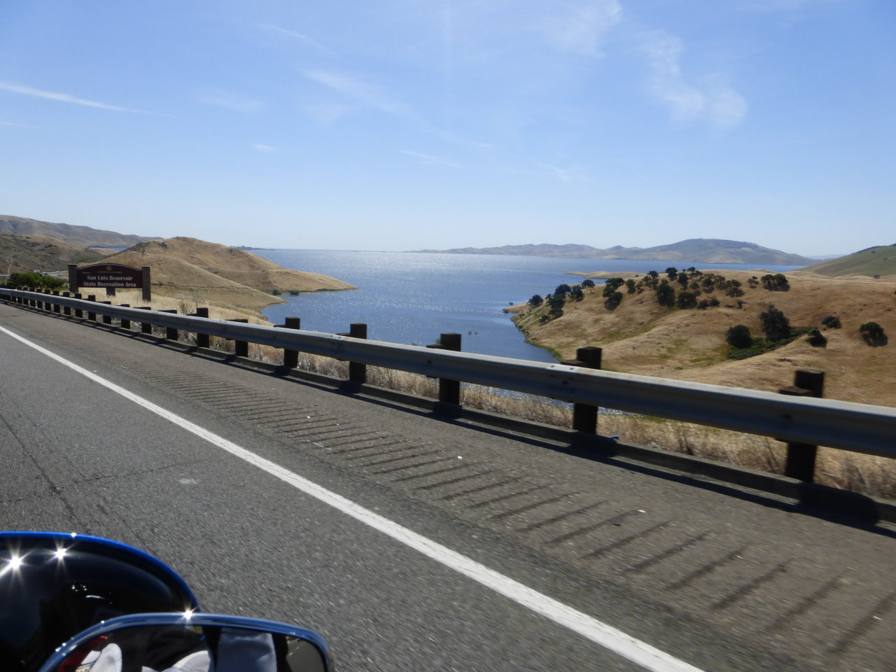 I left home exactly at 9:00 As I traveled down Hwy-85 I was thinking two thoughts How nice it is to be riding, and How long a trip this is going to be Well, long journeys begin with a single step so here I go The morning clouds seemed to be zig-zagging across the sky And the airliners were carving their paths in the blue It is still Spring enough for the hills to be green San Louis Reservoir on Hwy-152 is absolutely full |