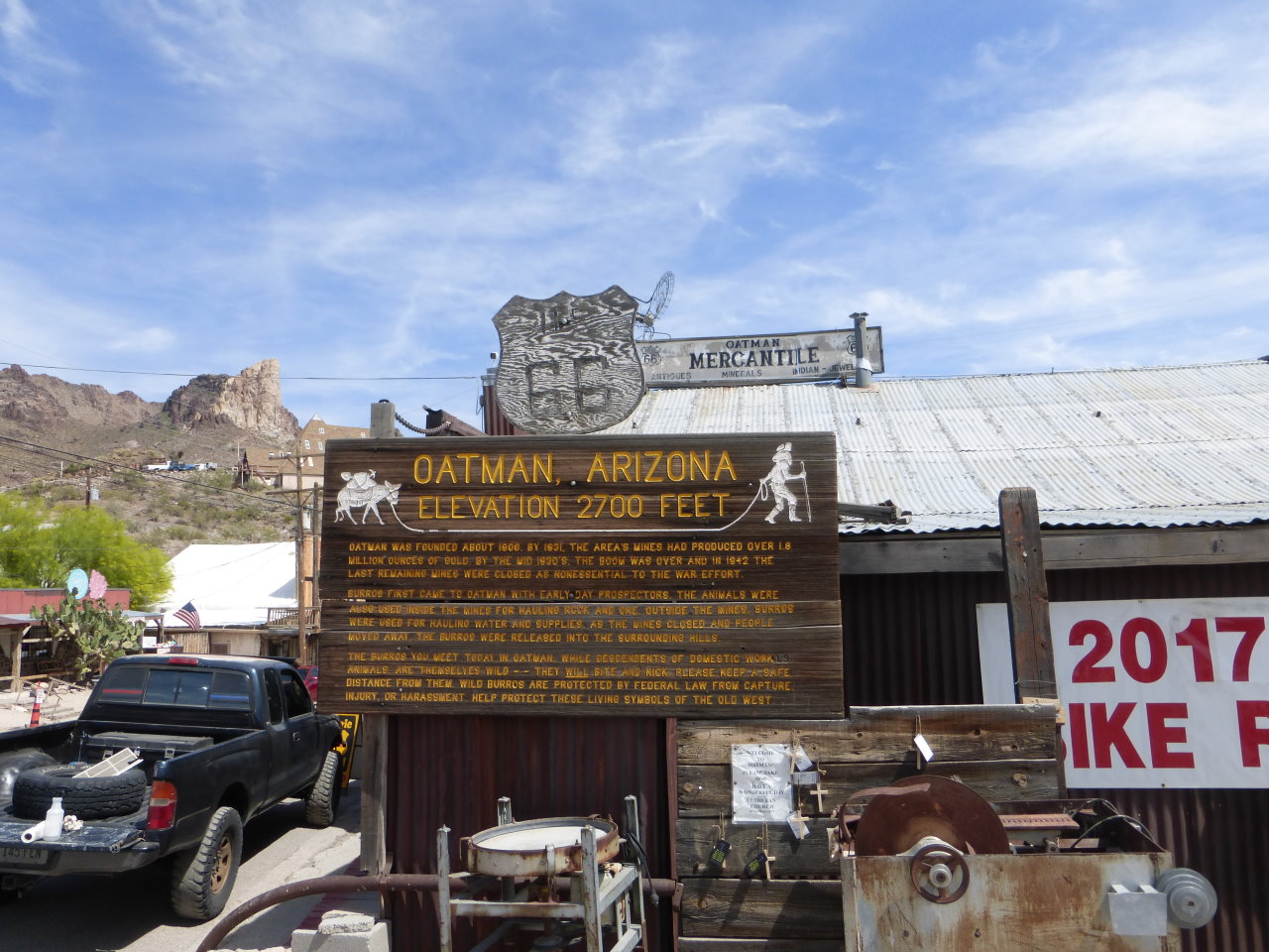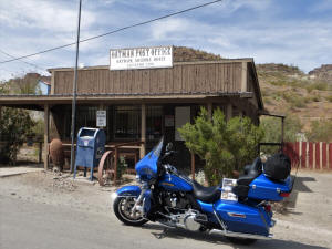 Oatman, AZ, it is always fun On the way I passed a bank sign that said 109 degrees, whew! final 12 miles is on Boundary Cone Road, not very good shape The burros were out in force. Being a Friday, there were not all that many of us tourists I shot one final Oatman photo at the post office This shows I have been to Arizona, my second state this year |