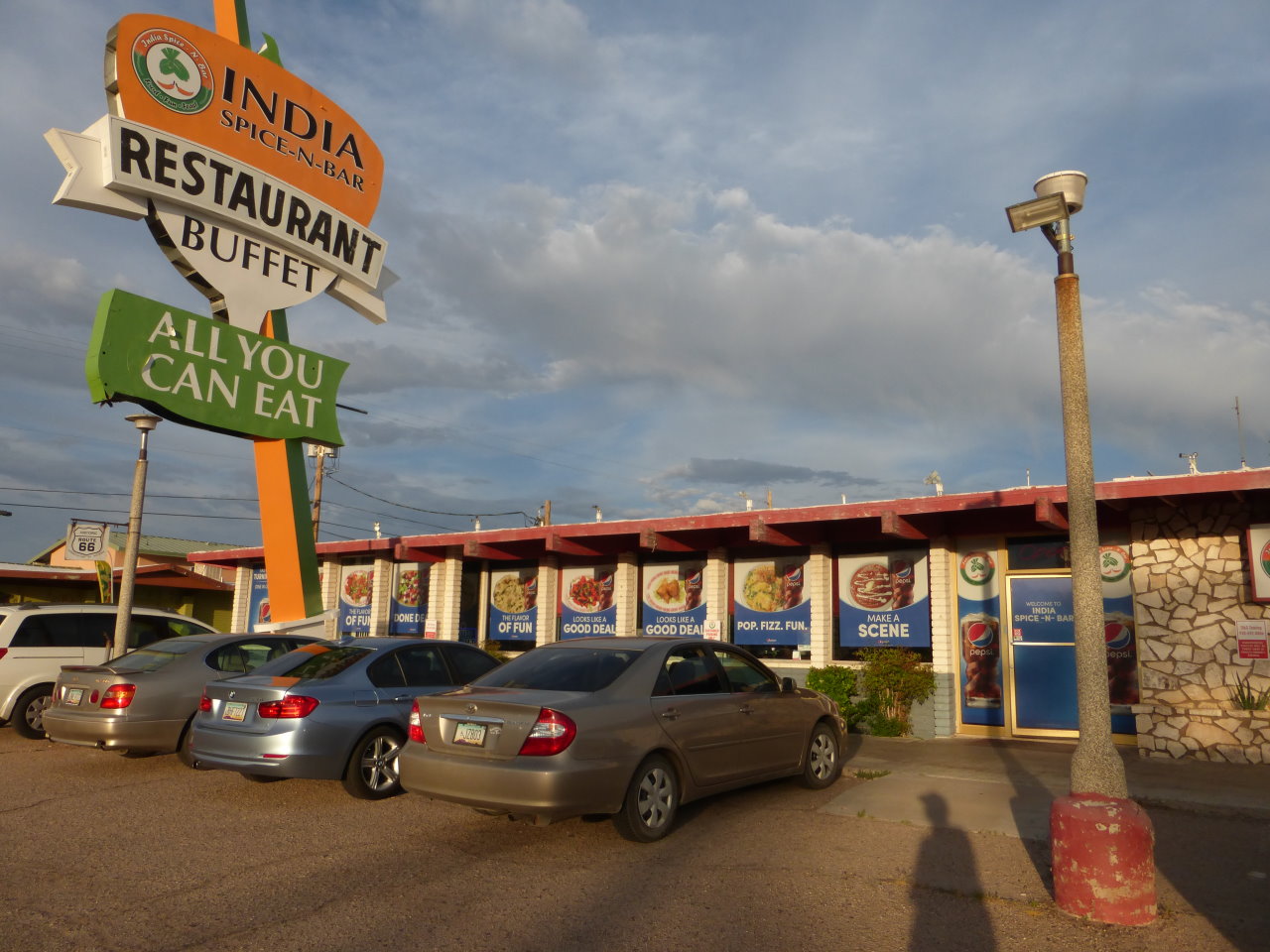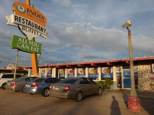 motel is an Indian restaurant. In Kingman, AZ? How good can it be? Well, what the heck A buffet, all you can eat. One table has vegetarian, another non A third had salads, fruit and deserts Turns out it is very good. I ate way too much and had a King Fisher to boot. Now, composing this page, it is hard to concentrate, sleepy |