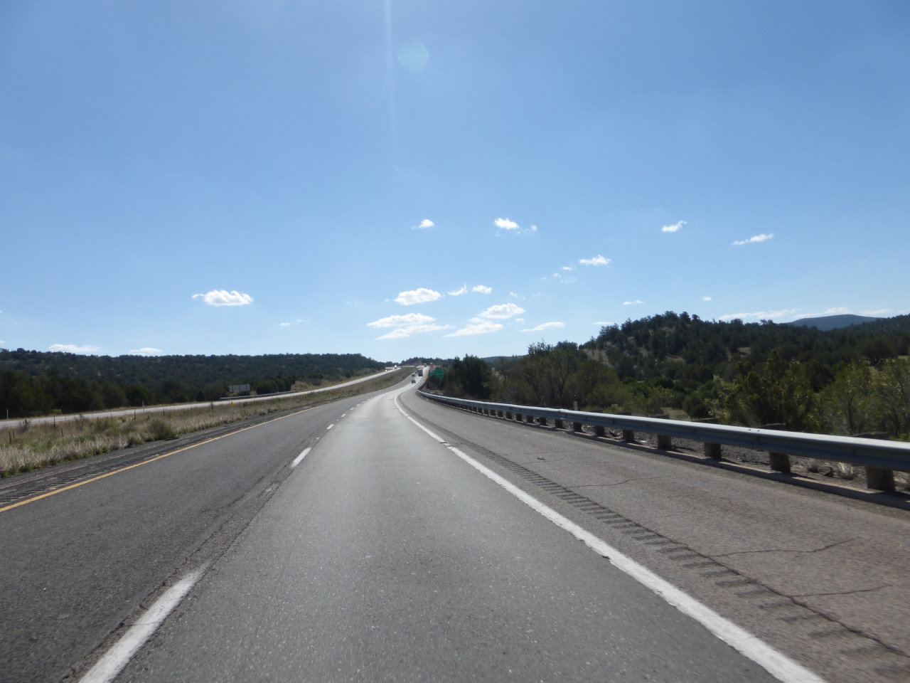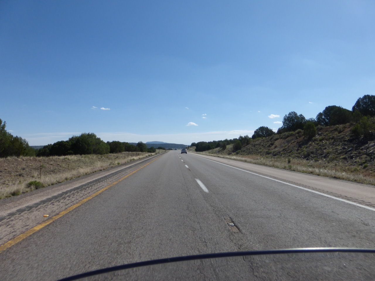 yesterday feeds winds. All day the winds were extremely strong from the south. Even the trucks were wandering in and sometimes out of their lane. Passing a truck, you encounter the trailing turbulance first. Since the wind is from the right, you experience it in the fast lane very early. Then as you pull alongside, the truck shadows you from the wind and the bike, still in an attitude to fend off the wind, is drawn toward the truck. Then as you pass the front, the wind returns. augmented by the bow wake of the truck. and you surge back to the left. |