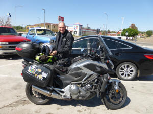 About an hour down the road, I stopped by a McDonald's for a breakfast burrito Another biker also pulled in He is returning from the west coast to his home in Alabama He seemed very tired and very ancient, moved quite tentavely His bike was far lighter than mine and not so powerful Said he had a rough time in the heavy winds the last few days He had many religious stickers on his bike I hope his deity watches over him on his way home |