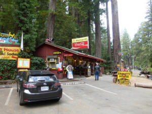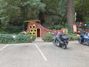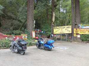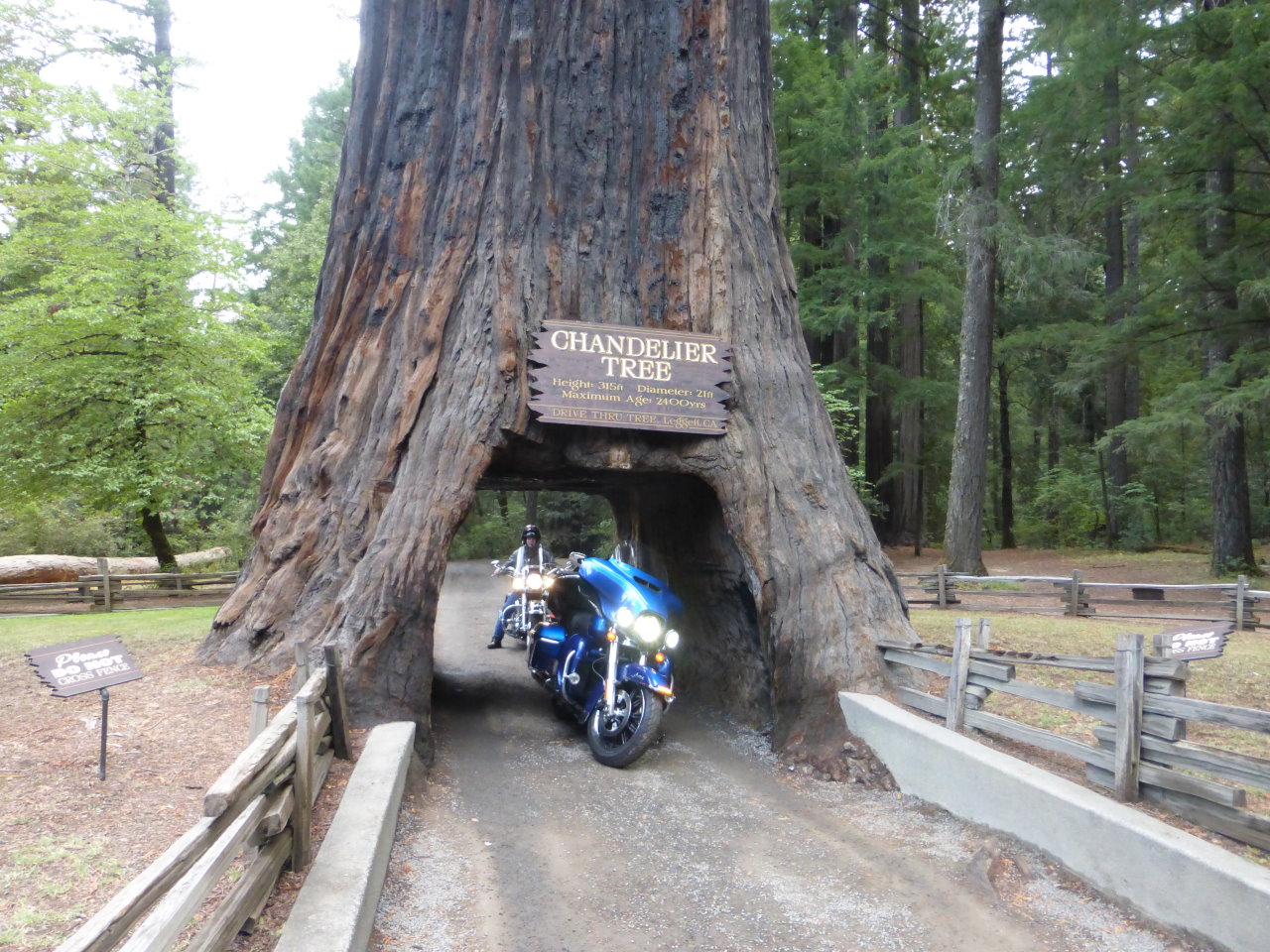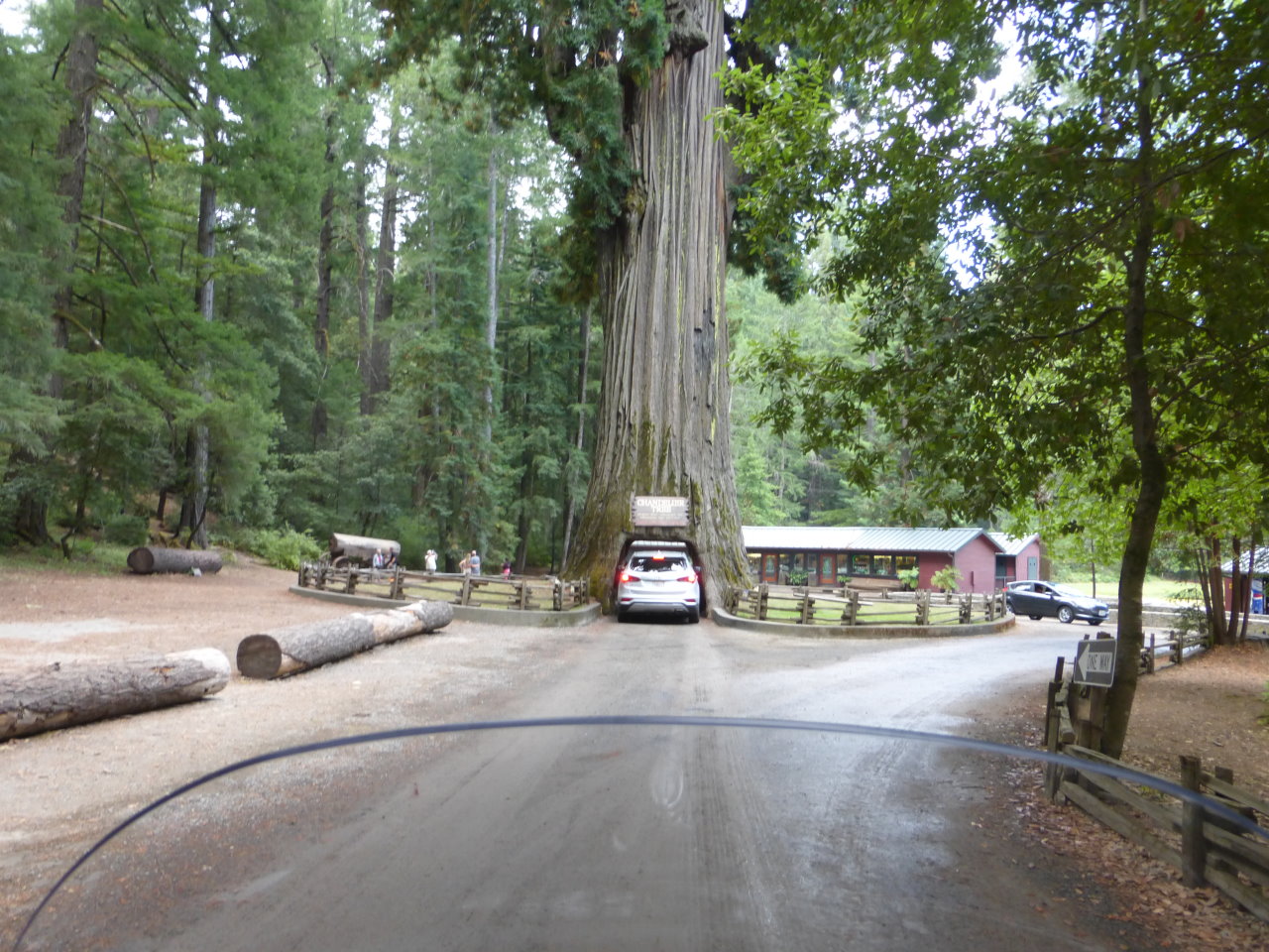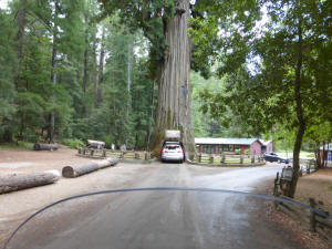 Drive Thru Tree Redwoods like moisture. Riding into the property, the road was very wet, muddy and slippery As I moved my bike into the tree, the rear tire fish-tailled rather remarkably and I had visions of getting all muddy Fortunately, I was able to keep upright, but it was exciting |
