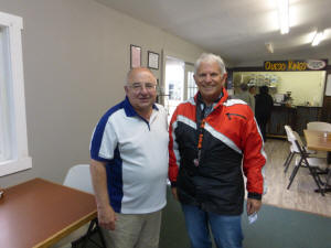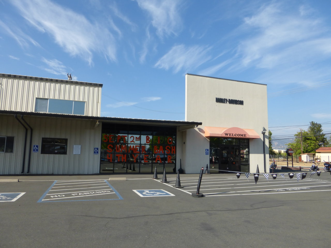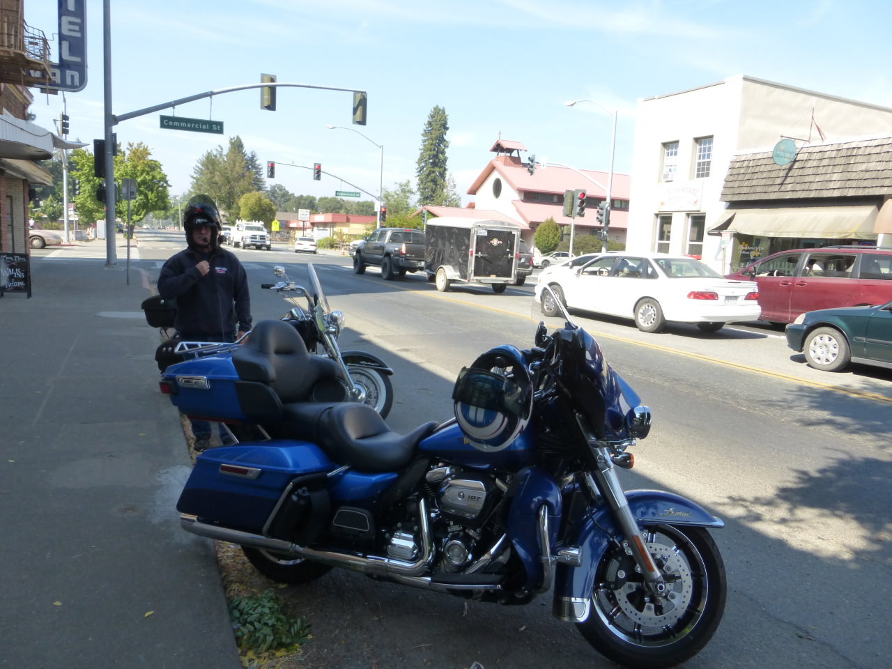Redwood Harley-Davidson before they opened The service department heard our tale of woe and went into action The engine guard (crash bar) on Jason's bike was bent to the point that the gear shift lever was hard to reach Long story short, they had a new part and mounted it in about an hour and a half While waiting, we met some real nice people One couple was from Texas by way of Mississippi and Idaho Another couple was from Massachusetts We gassed up and were on the road before ten o'clock |