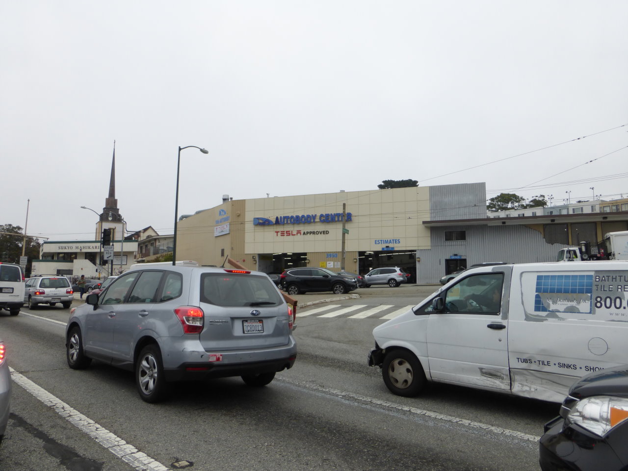 I headed out about 9:00. Big Mistake Traffic up CA-85 was impossible. I-280 was even worse. Around Belmont it started to lighten up a bit I finally reached San Francisco and drove straight through I did not know that some garages are certified Tesla body shops Going up 19th, the fog was becoming evident. Normally, you can see the Golden Gate Bridge towers from here |